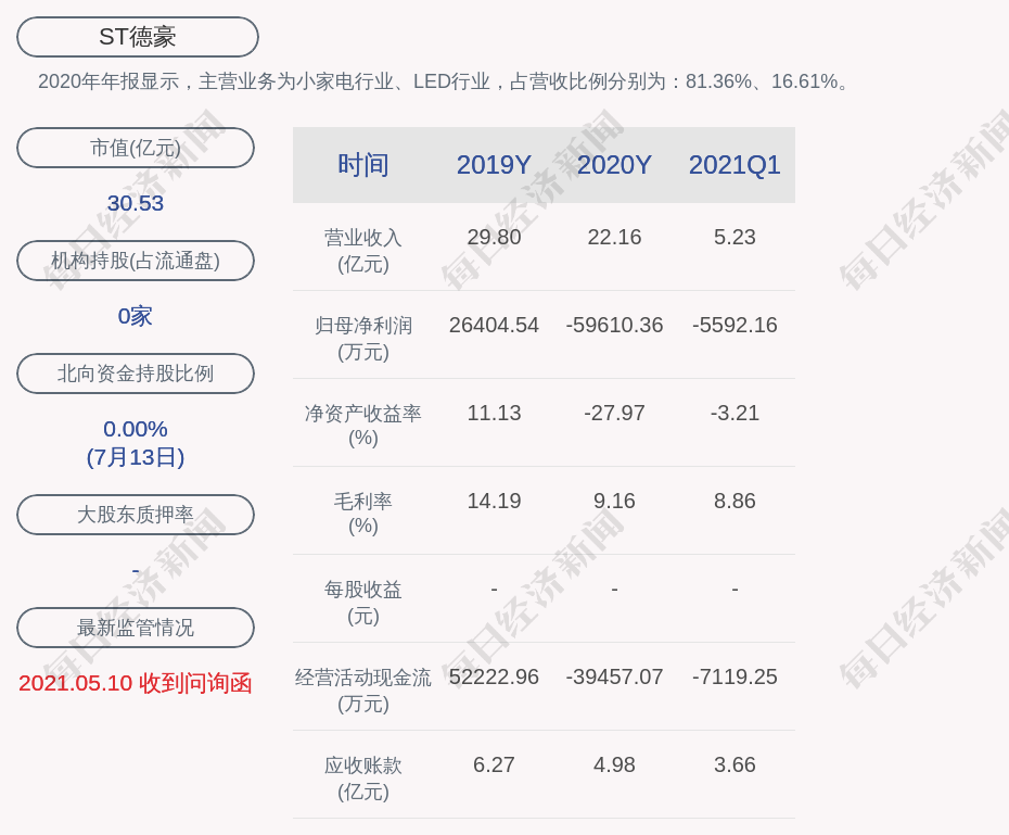 2020年年报显示,ST德豪的主营业务为小家电行业、LED行业,占营收比例分别为:81.36%、16.61%。