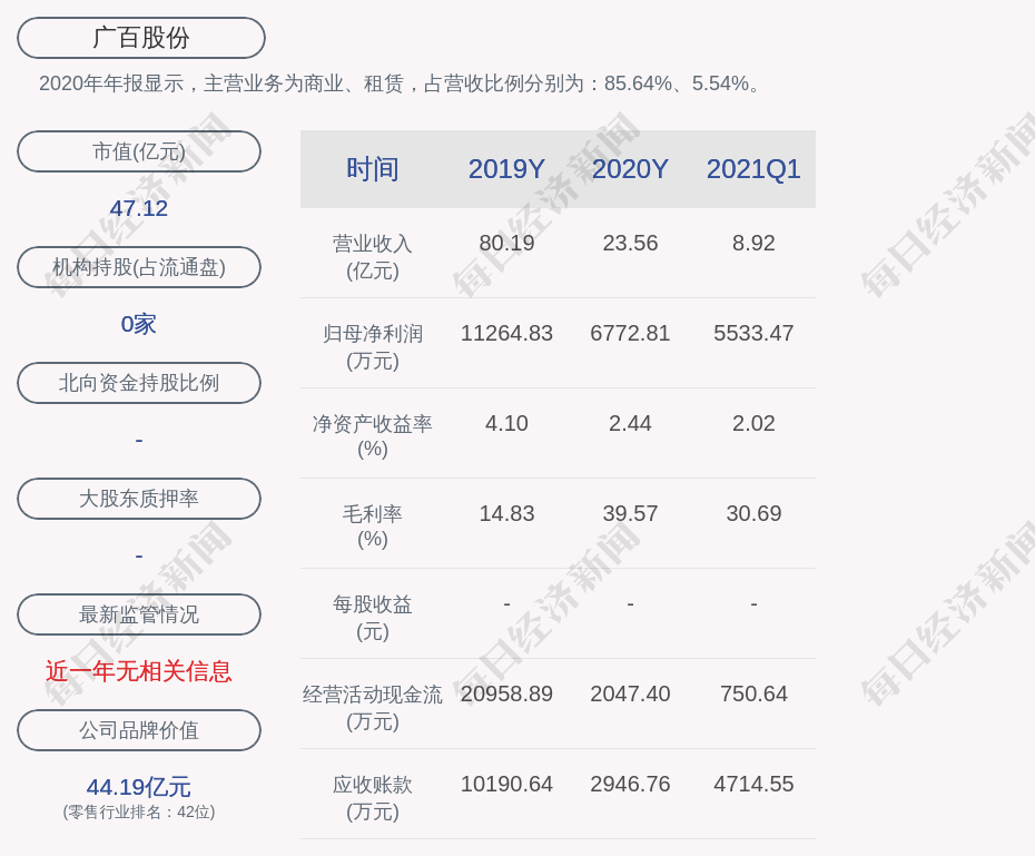 2020年年报显示,广百股份的主营业务为商业、租赁,占营收比例分别为:85.64%、5.54%。