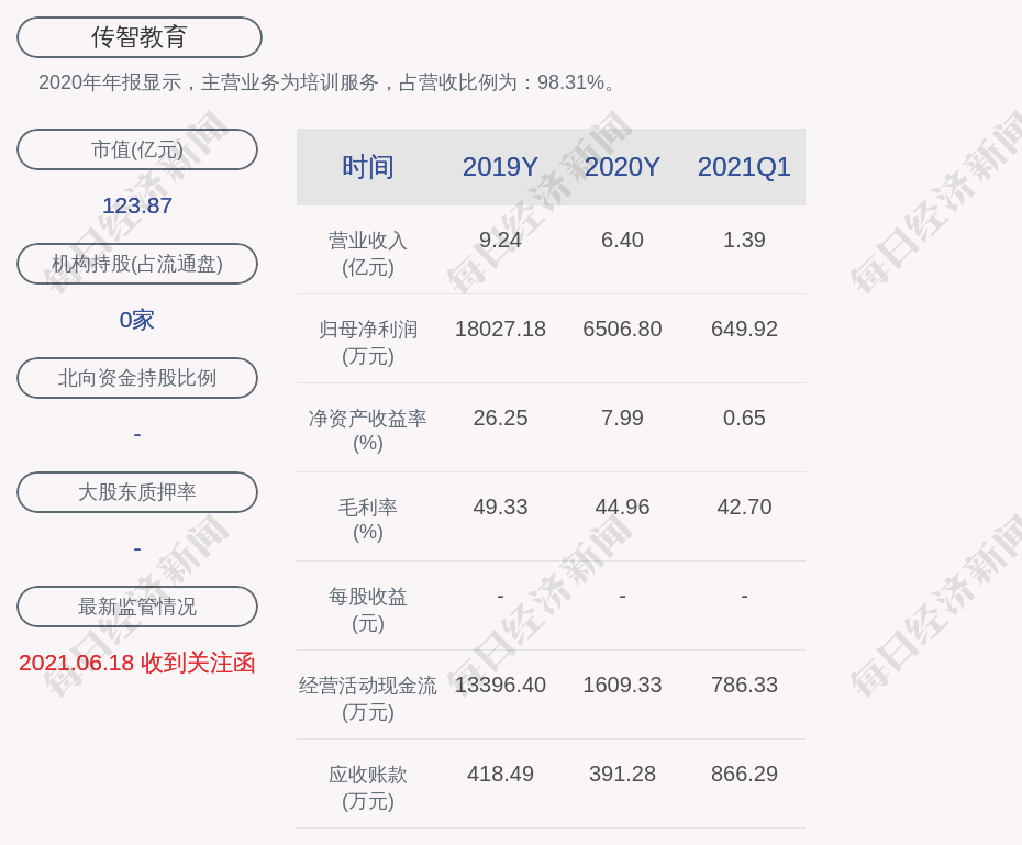 2020年年报显示,传智教育的主营业务为培训服务,占营收比例为:98.31%。