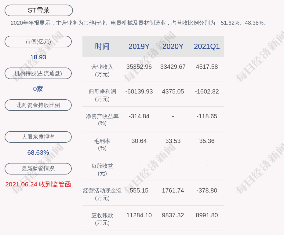 2020年年报显示,ST雪莱的主营业务为其他行业、电器机械及器材制造业,占营收比例分别为:51.62%、48.38%。