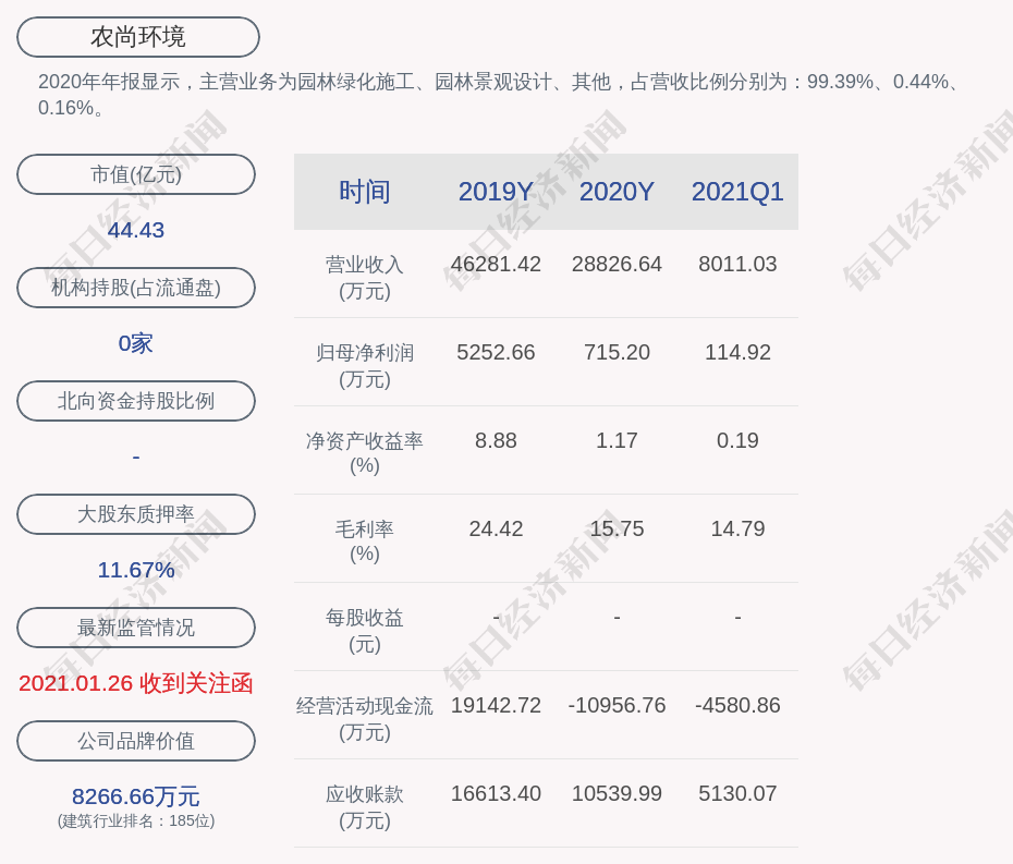 2020年年报显示,农尚环境的主营业务为园林绿化施工、园林景观设计、其他,占营收比例分别为:99.39%、0.44%、0.16%。