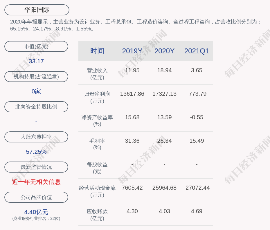2020年年报显示,华阳国际的主营业务为设计业务、工程总承包、工程造价咨询、全过程工程咨询,占营收比例分别为:65.15%、24.17%、8.91%、1.55%。