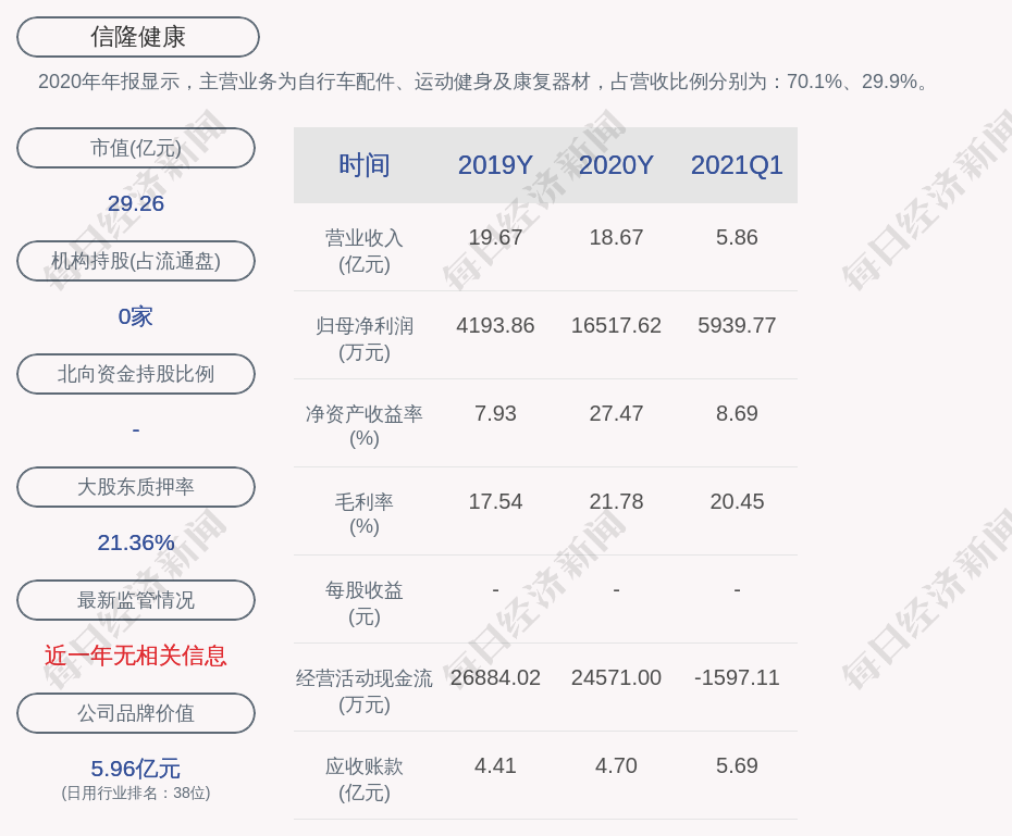 2020年年报显示,信隆健康的主营业务为自行车配件、运动健身及康复器材,占营收比例分别为:70.1%、29.9%。
