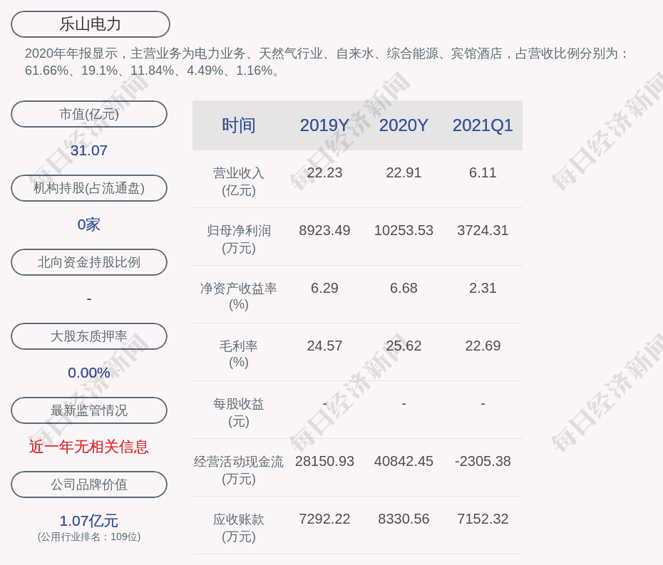 2020年年报显示,乐山电力的主营业务为电力业务、天然气行业、自来水、综合能源、宾馆酒店。