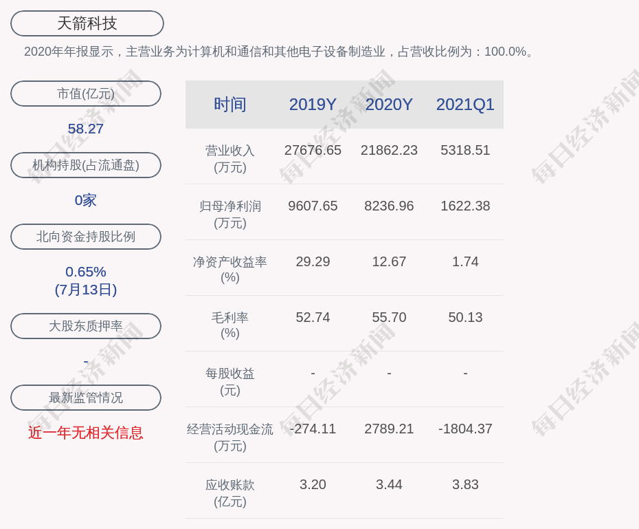 2020年年报显示,天箭科技的主营业务为计算机和通信和其他电子设备制造业,占营收比例为:100.0%。