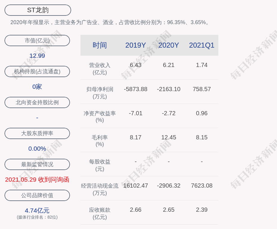 2020年年报显示,ST龙韵的主营业务为广告业、酒业,占营收比例分别为:96.35%、3.65%。