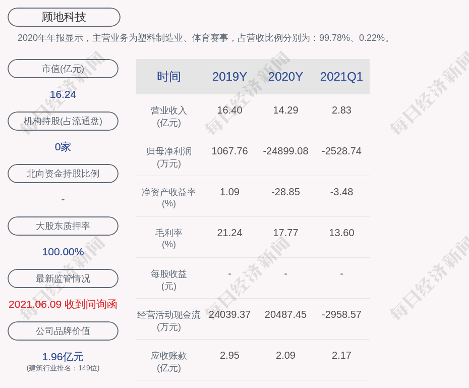 2020年年报显示,顾地科技的主营业务为塑料制造业、体育赛事,占营收比例分别为:99.78%、0.22%。