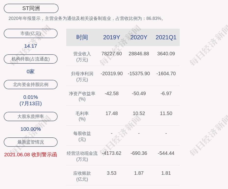 2020年年报显示,ST同洲的主营业务为通信及相关设备制造业,占营收比例为:86.83%。