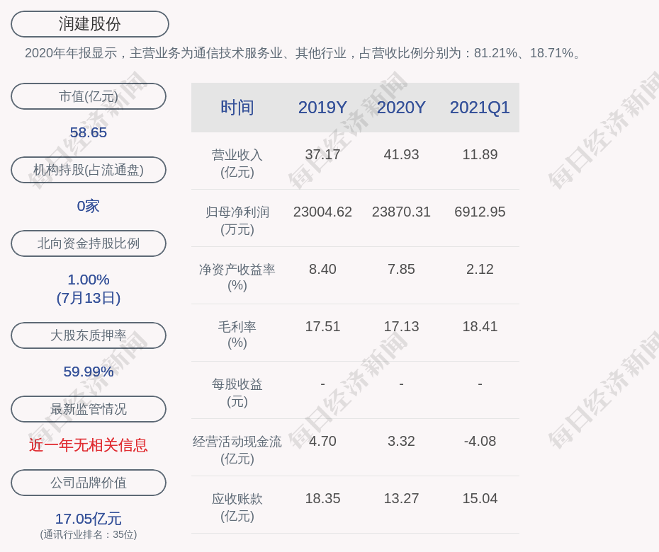 2020年年报显示,润建股份的主营业务为通信技术服务业、其他行业,占营收比例分别为:81.21%、18.71%。