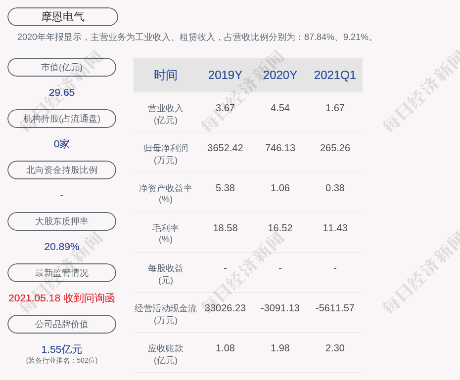 2020年年报显示,摩恩电气的主营业务为工业收入、租赁收入,占营收比例分别为:87.84%、9.21%。