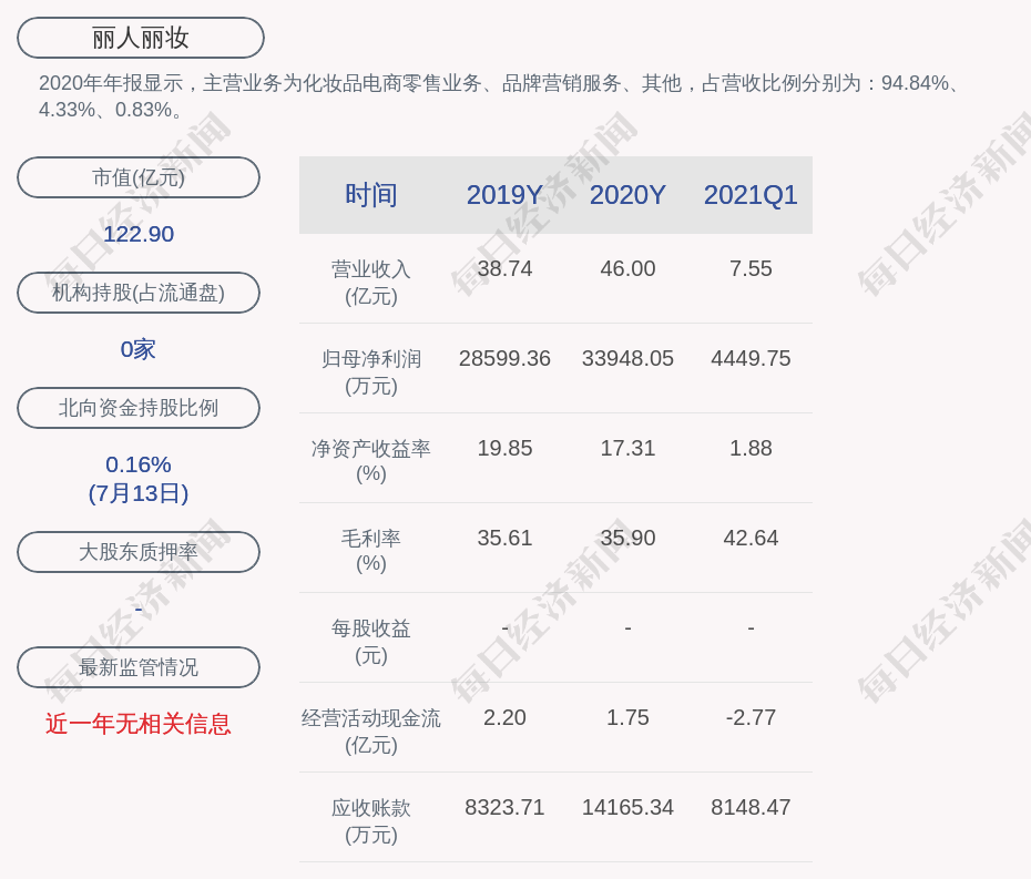 2020年年报显示,丽人丽妆的主营业务为化妆品电商零售业务、品牌营销服务、其他,占营收比例分别为:94.84%、4.33%、0.83%。