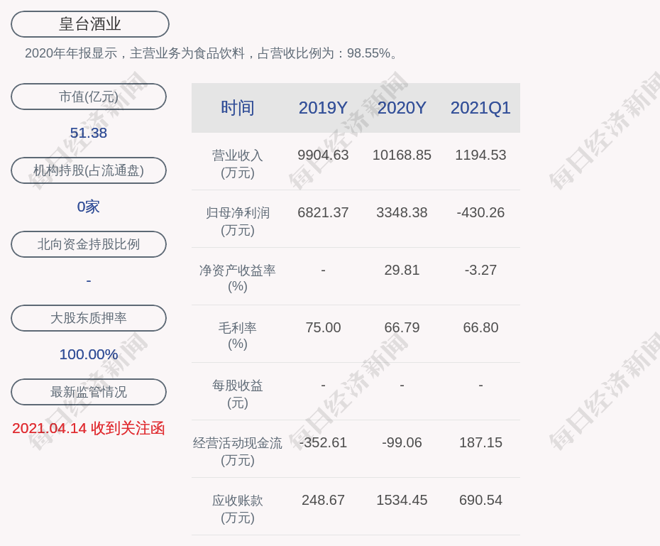 2020年年报显示,皇台酒业的主营业务为食品饮料,占营收比例为:98.55%。