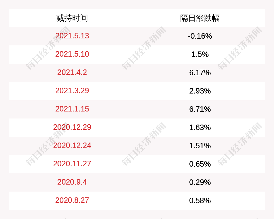 2. 海波重科上次发布减持公告是2021年05月13日,第二个交易日下跌0.16%,海波重科近一年共发布11次减持类公告。更多关键信息,请搜索“道达号”。