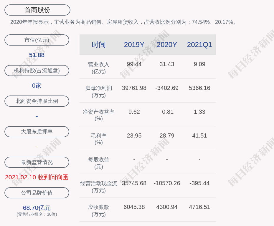 2020年年报显示,首商股份的主营业务为商品销售、房屋租赁收入,占营收比例分别为:74.54%、20.17%。
