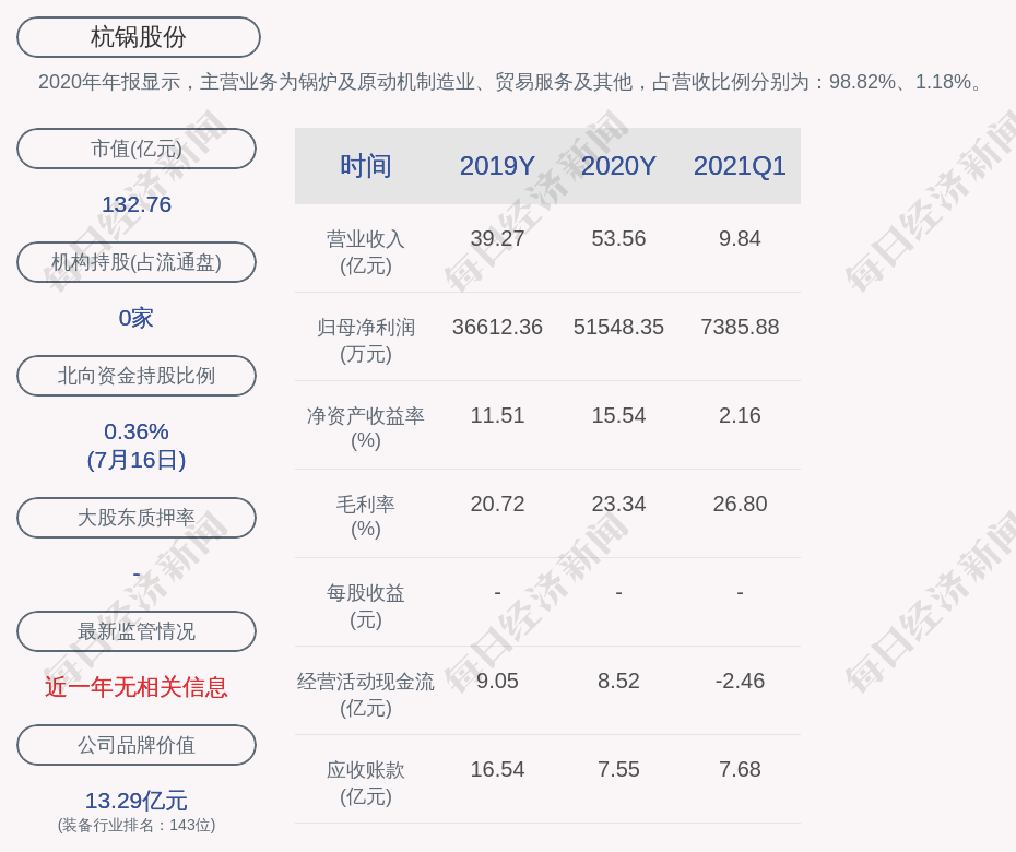 2020年年报显示,杭锅股份的主营业务为锅炉及原动机制造业、贸易服务及其他,占营收比例分别为:98.82%、1.18%。