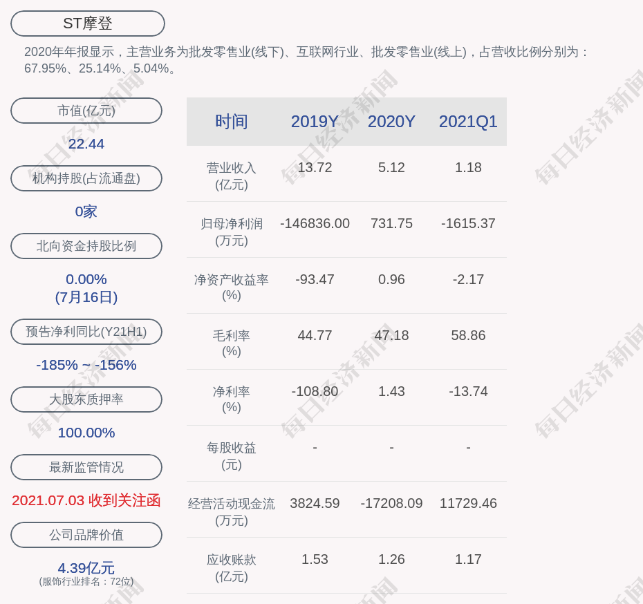 2020年年报显示,ST摩登的主营业务为批发零售业(线下)、互联网行业、批发零售业(线上),占营收比例分别为:67.95%、25.14%、5.04%。