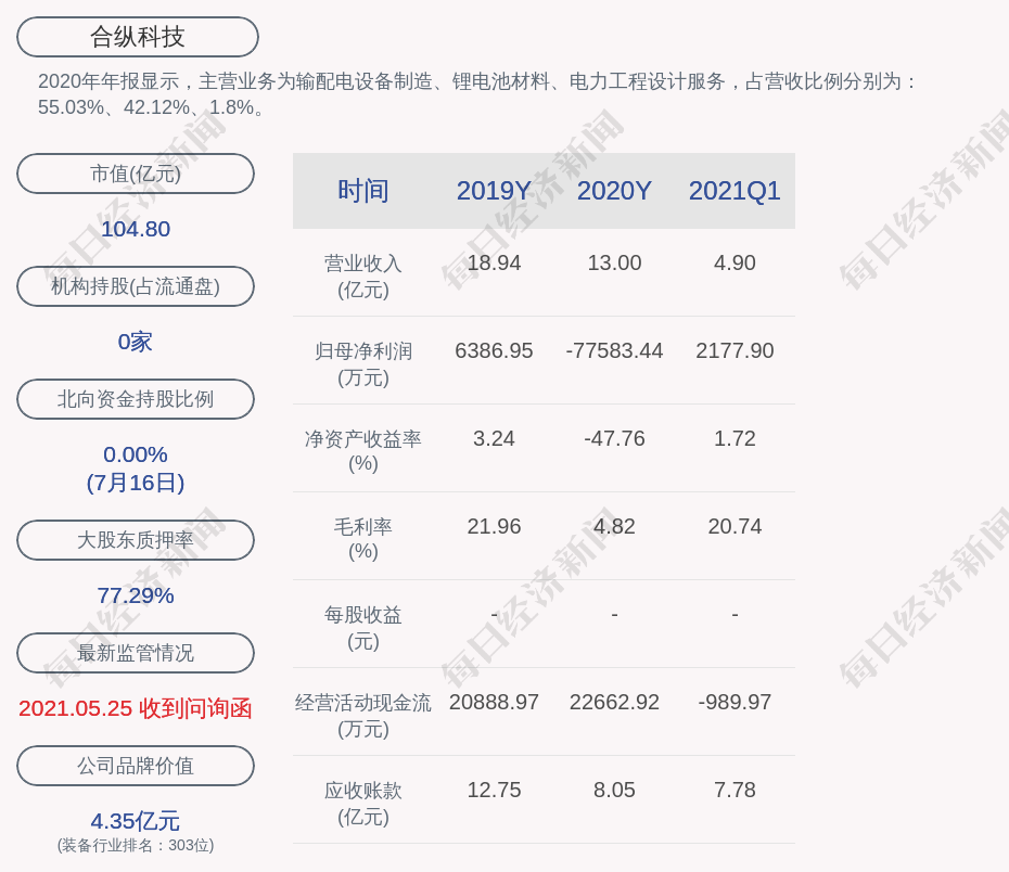 2020年年报显示,合纵科技的主营业务为输配电设备制造、锂电池材料、电力工程设计服务,占营收比例分别为:55.03%、42.12%、1.8%。