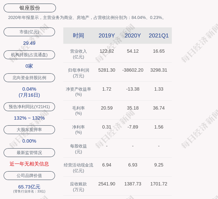 2020年年报显示,银座股份的主营业务为商业、房地产,占营收比例分别为:84.04%、0.23%。