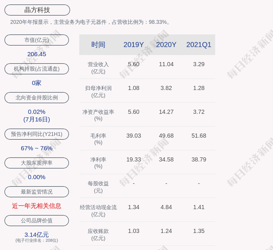 2020年年报显示,晶方科技的主营业务为电子元器件,占营收比例为:98.33%。