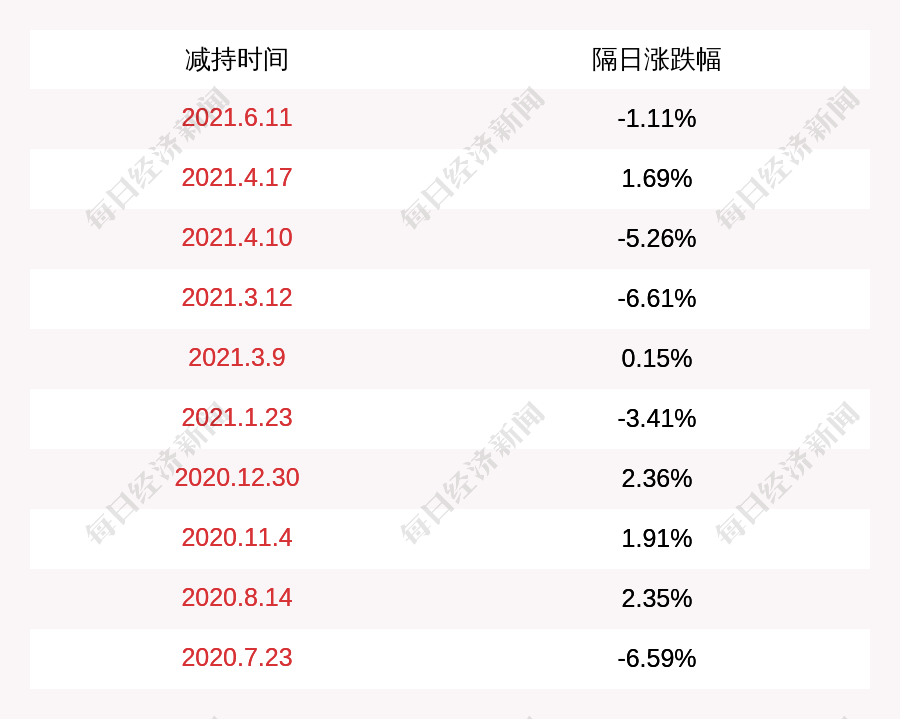 3. 晶方科技上次发布减持公告是2021年06月11日,第二个交易日下跌1.11%,晶方科技近一年共发布11次减持类公告。更多关键信息,请搜索“道达号”。