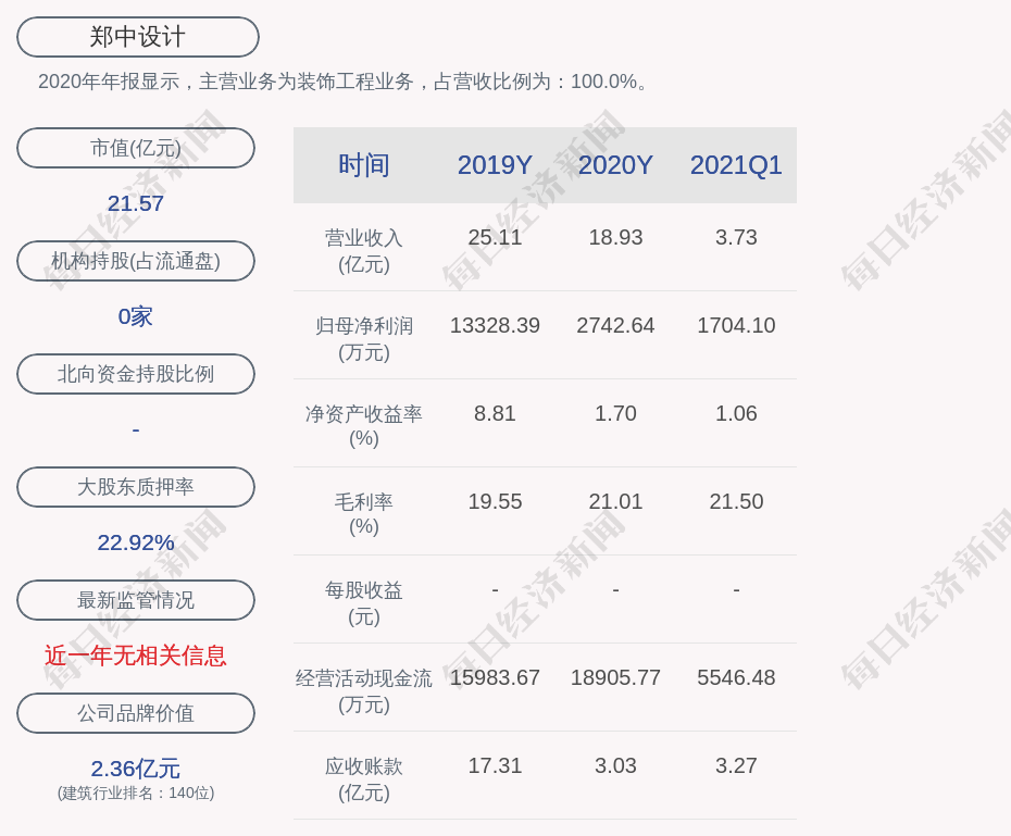 2020年年报显示,郑中设计的主营业务为装饰工程业务,占营收比例为:100.0%。