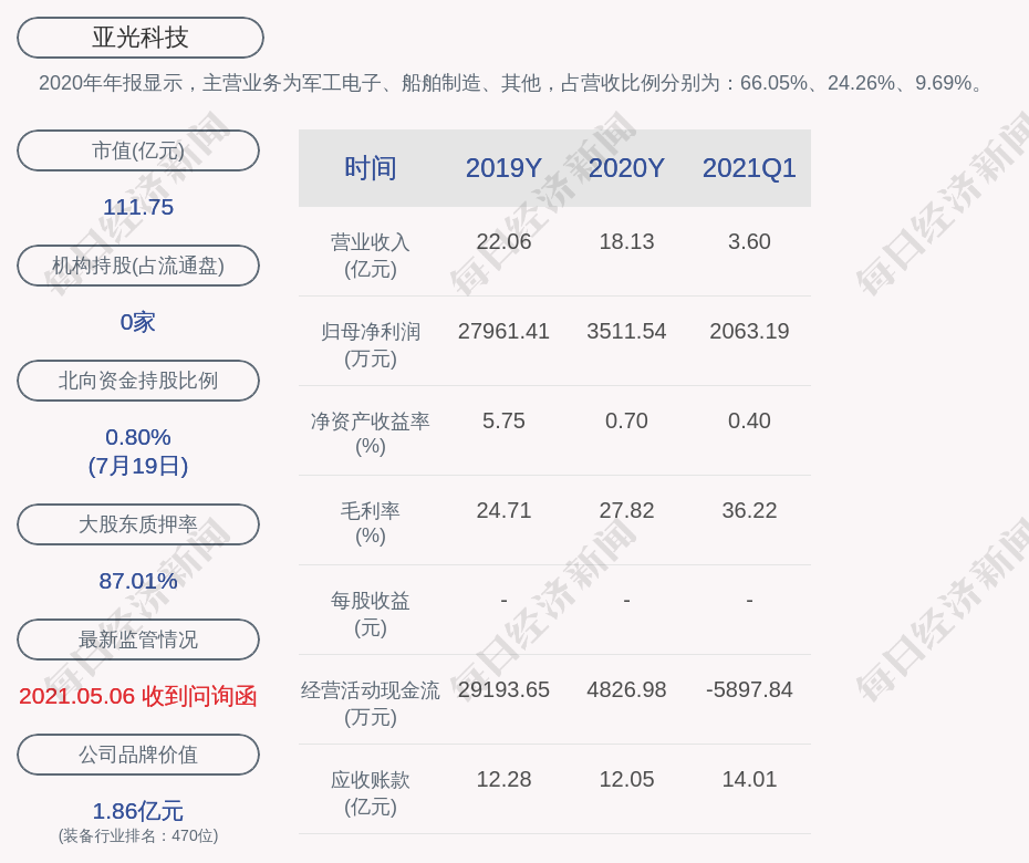2020年年报显示,亚光科技的主营业务为军工电子、船舶制造、其他,占营收比例分别为:66.05%、24.26%、9.69%。