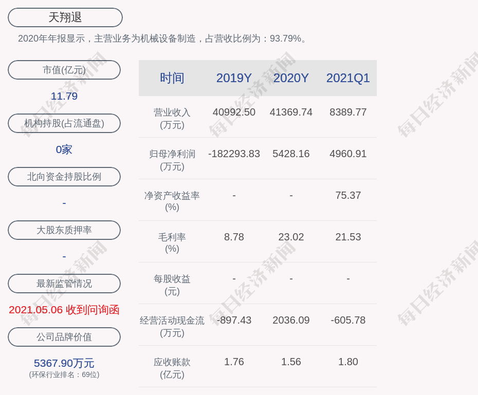 2020年年报显示,天翔环境的主营业务为机械设备制造,占营收比例为:93.79%。
