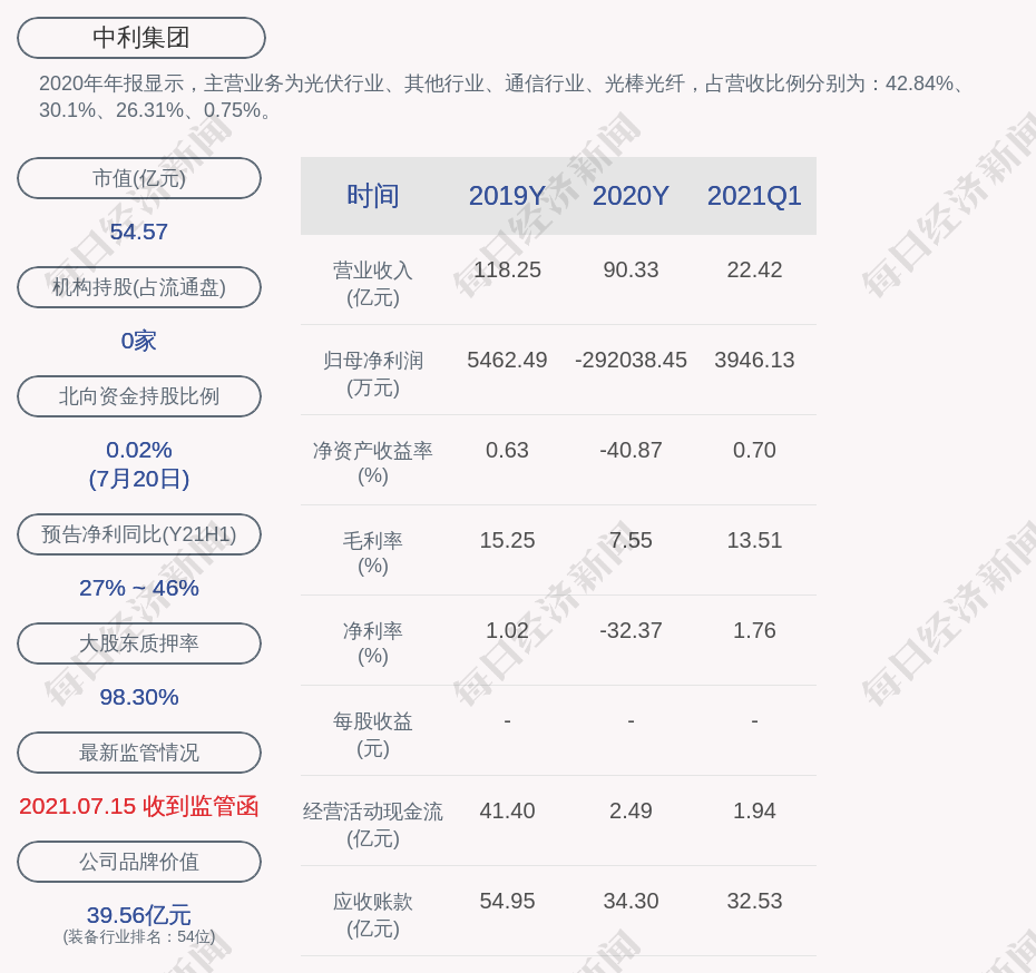 2020年年报显示,中利集团的主营业务为光伏行业、其他行业、通信行业、光棒光纤,占营收比例分别为:42.84%、30.1%、26.31%、0.75%。