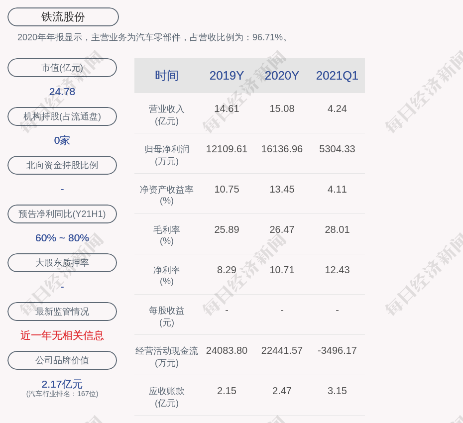 每经AI快讯,铁流股份(SH 603926,收盘价:15.47元)7月21日晚间发布业绩预告,2021年上半年归属于上市公司股东的净利润9544.32万元~10737.36万元。业绩变动主要原因是,本报告期,受益于社会消费复苏、基建投资回暖、重大项目开工、全面推广“国六”排放标准等外部良好的发展环境,公司迎来订单的显著增长。本报告期,公司各业务板块根据董事会制定的经营目标积极开拓市场。整车配套市场和主流商用车整车企业的合作加强,销量增速较快;汽车后市场得益于深耕多年且辐射全国的营销网络,业务渗透率也逐渐提升;国际市场因境外疫情得到有效控制,呈现了较快的增长态势。综合来看,整体业务水平及销量均显著提升。