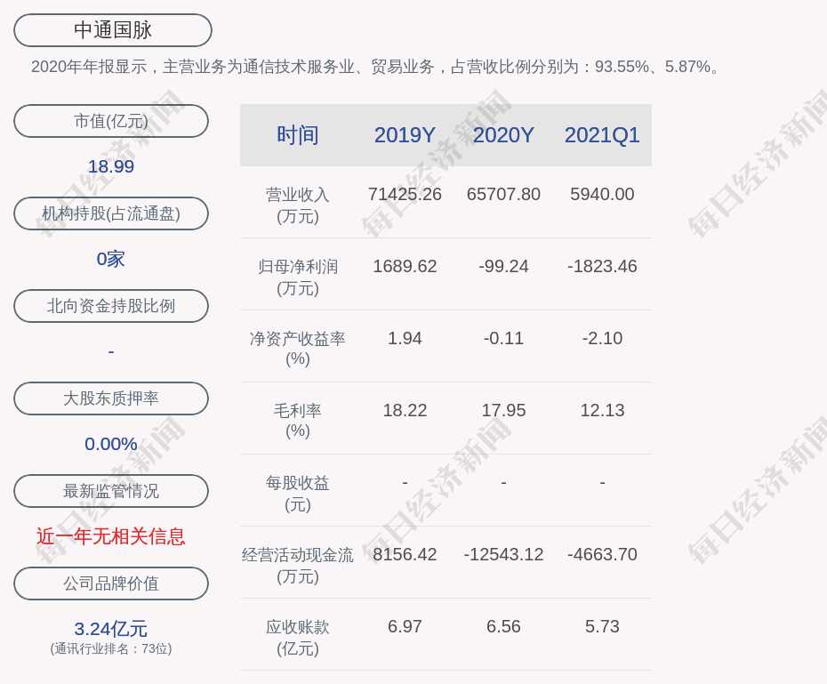 2020年年报显示,中通国脉的主营业务为通信技术服务业、贸易业务,占营收比例分别为:93.55%、5.87%。