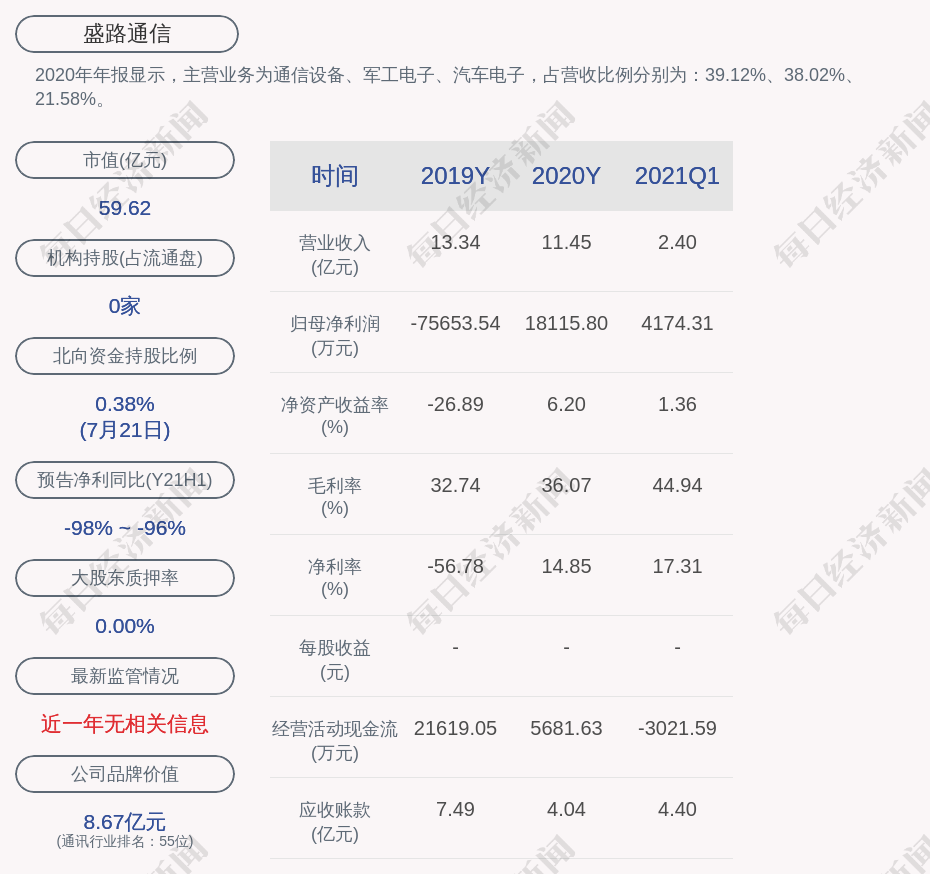 2020年年报显示,盛路通信的主营业务为通信设备、军工电子、汽车电子,占营收比例分别为:39.12%、38.02%、21.58%。