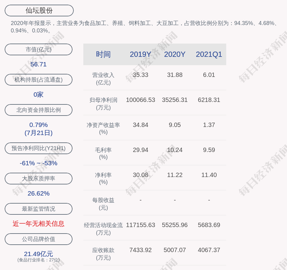 2020年年报显示,仙坛股份的主营业务为食品加工、养殖、饲料加工、大豆加工,占营收比例分别为:94.35%、4.68%、0.94%、0.03%。