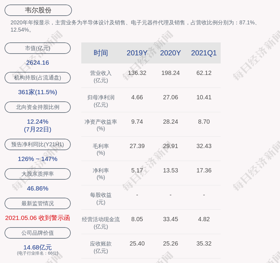 2020年年报显示,韦尔股份的主营业务为半导体设计及销售、电子元器件代理及销售,占营收比例分别为:87.1%、12.54%。