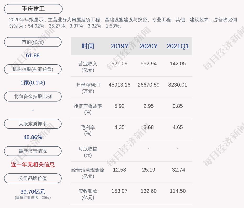 2020年年报显示,重庆建工的主营业务为房屋建筑工程、基础设施建设与投资、专业工程、其他、建筑装饰,占营收比例分别为:54.92%、35.27%、3.37%、3.32%、1.53%。