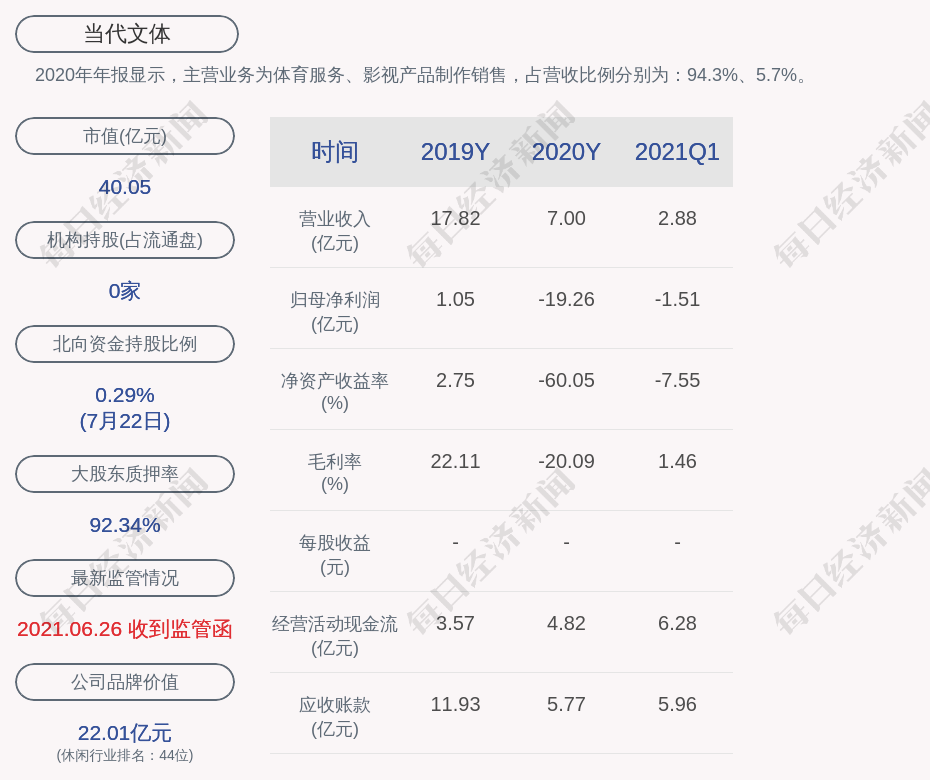 2020年年报显示,当代文体的主营业务为体育服务、影视产品制作销售,占营收比例分别为:94.3%、5.7%。