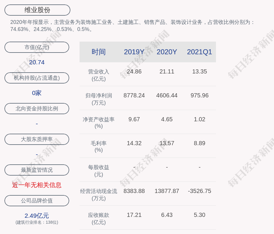 2020年年报显示,维业股份的主营业务为装饰施工业务、土建施工、销售产品、装饰设计业务,占营收比例分别为:74.63%、24.25%、0.53%、0.5%。