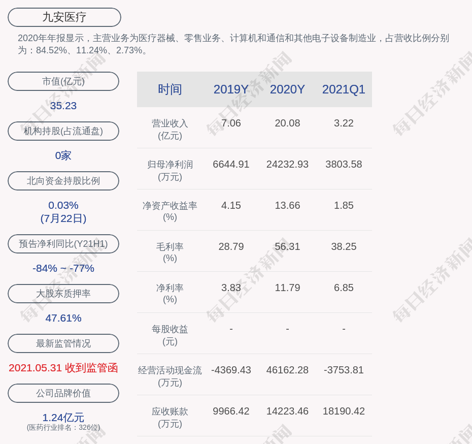 2020年年报显示,九安医疗的主营业务为医疗器械、零售业务、计算机和通信和其他电子设备制造业,占营收比例分别为:84.52%、11.24%、2.73%。