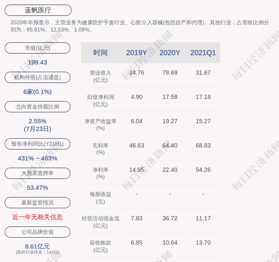 2020年年报显示,蓝帆医疗的主营业务为健康防护手套行业、心脏介入器械(包括自产和代理)、其他行业,占营收比例分别为:85.81%、12.53%、1.08%。