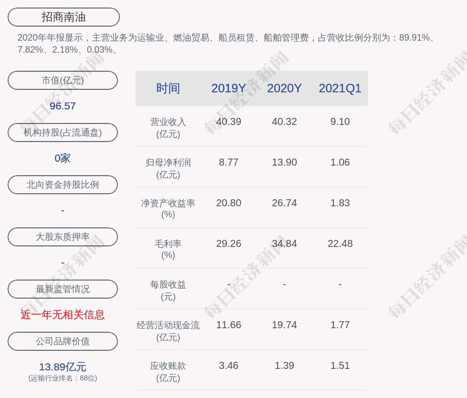 2020年年报显示,招商南油的主营业务为运输业、燃油贸易、船员租赁、船舶管理费,占营收比例分别为:89.91%、7.82%、2.18%、0.03%。