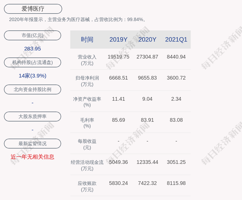 2020年年报显示,爱博医疗的主营业务为医疗器械,占营收比例为:99.84%。