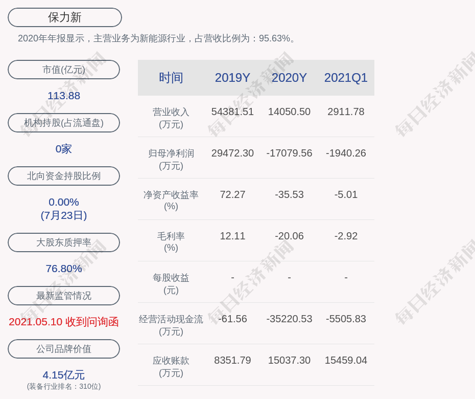 2020年年报显示,保力新的主营业务为新能源行业,占营收比例为:95.63%。