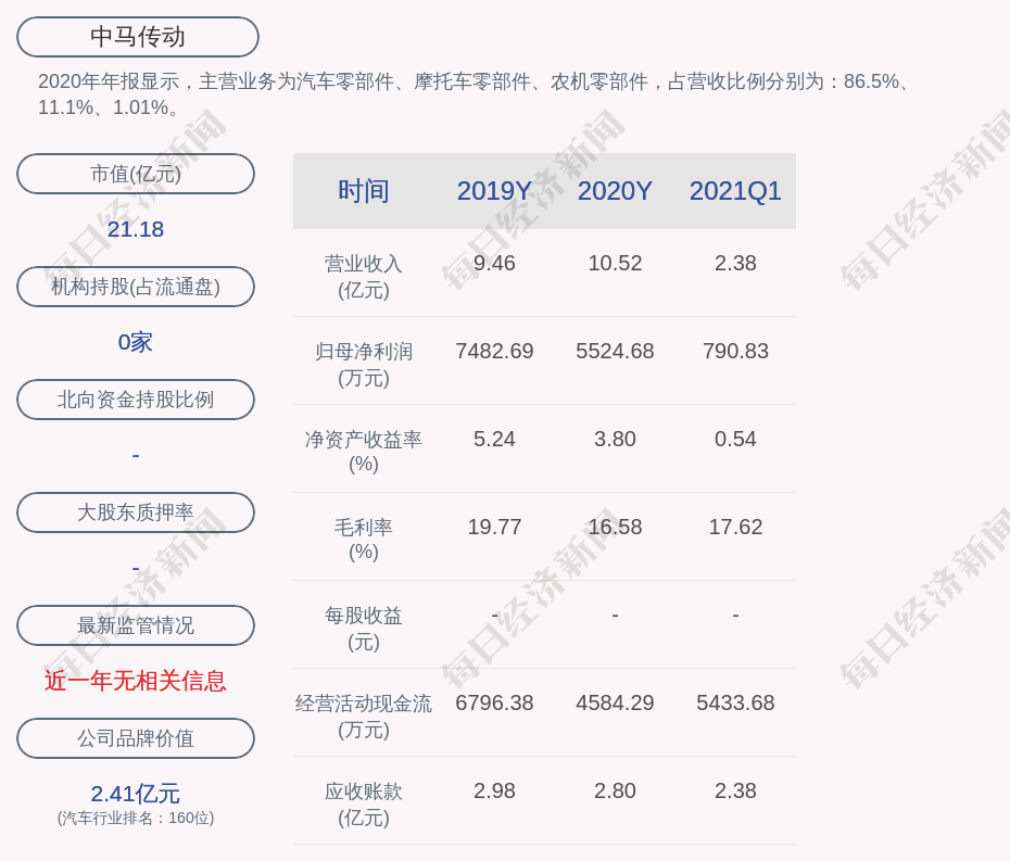 2020年年报显示,中马传动的主营业务为汽车零部件、摩托车零部件、农机零部件,占营收比例分别为:86.5%、11.1%、1.01%。