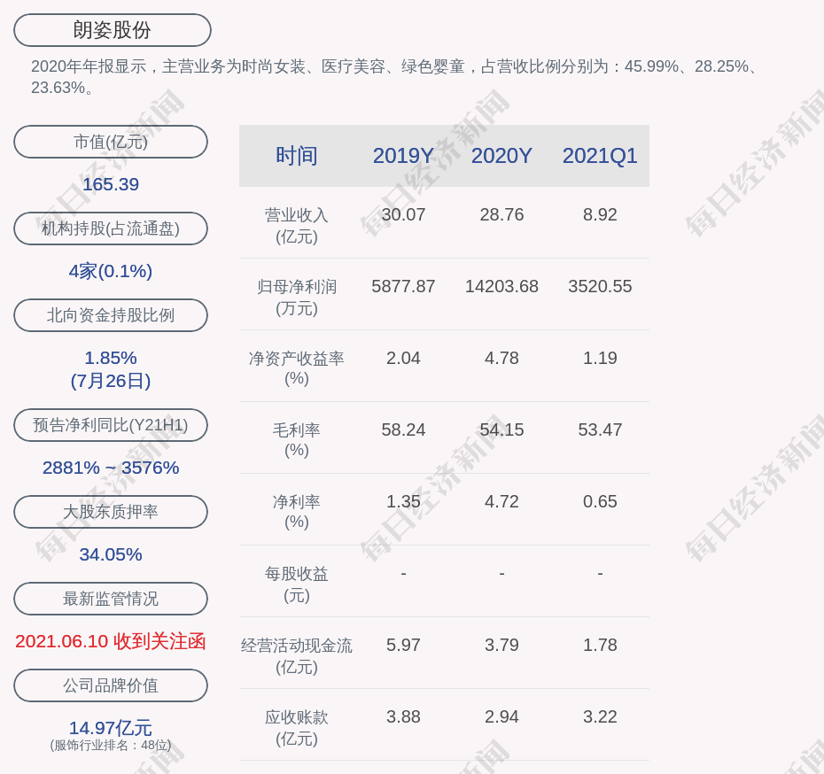 1. 朗姿股份近30日内北向资金持股量增加307.48万股,占流通股比例增加1.18%;