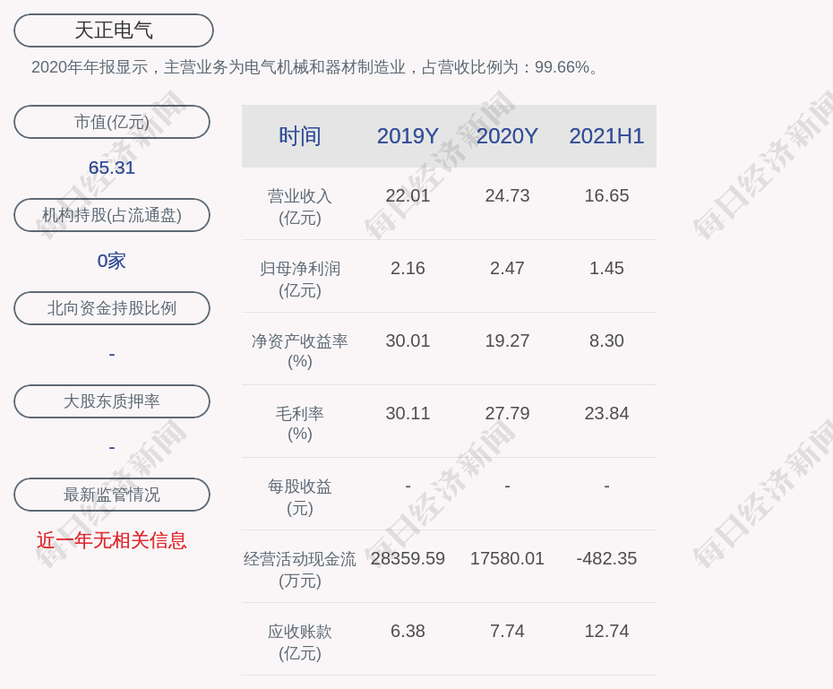 2020年年报显示,天正电气的主营业务为电气机械和器材制造业,占营收比例为:99.66%。