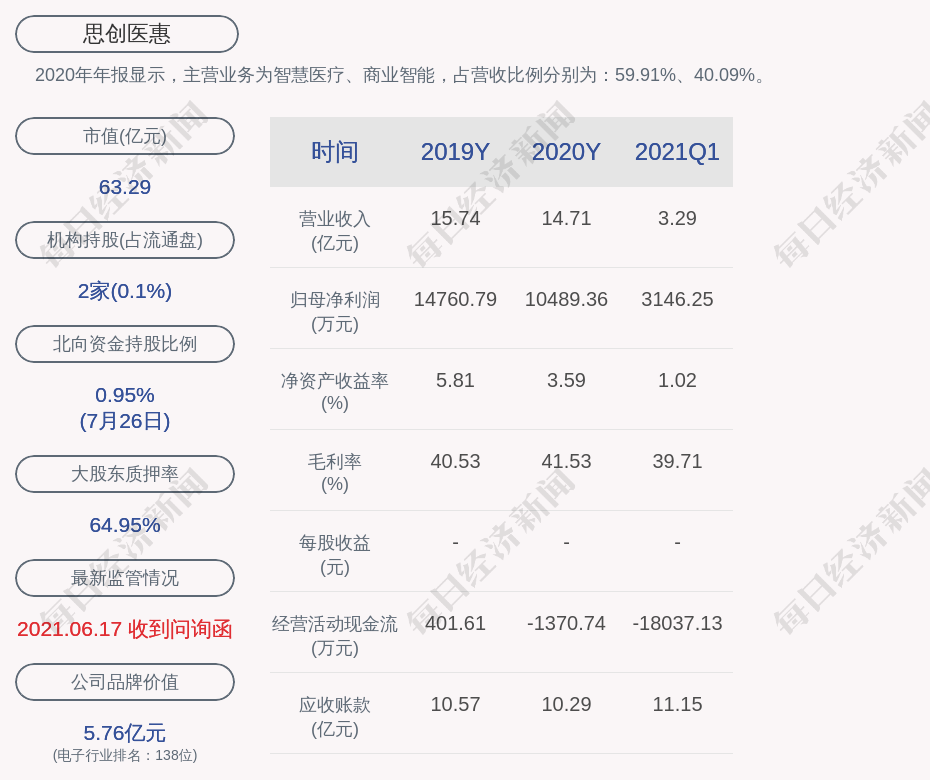 2020年年报显示,思创医惠的主营业务为智慧医疗、商业智能,占营收比例分别为:59.91%、40.09%。