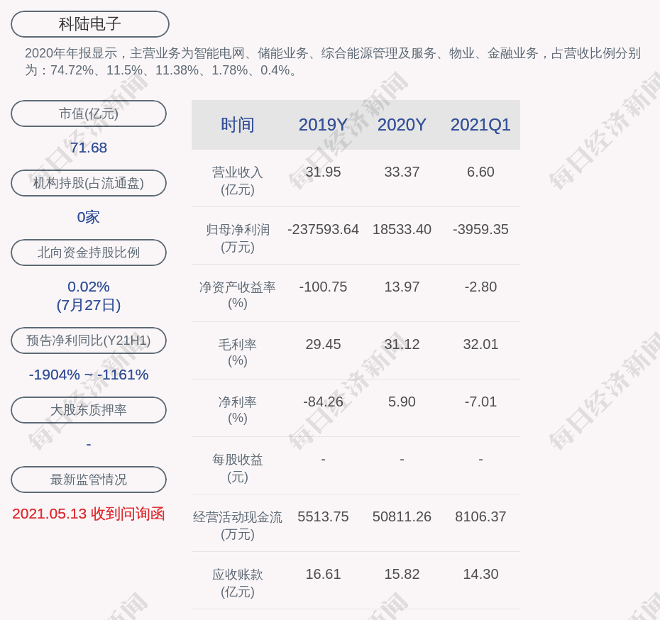 2020年年报显示,科陆电子的主营业务为智能电网、储能业务、综合能源管理及服务、物业、金融业务,占营收比例分别为:74.72%、11.5%、11.38%、1.78%、0.4%。