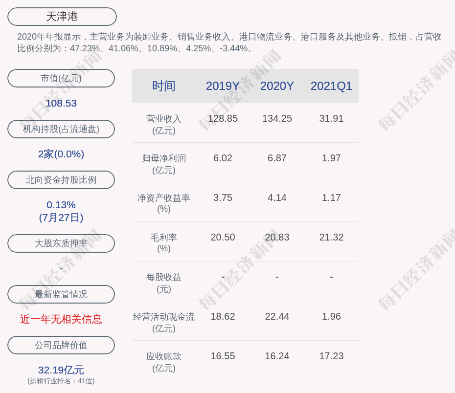 2020年年报显示,天津港的主营业务为装卸业务、销售业务收入、港口物流业务、港口服务及其他业务、抵销,占营收比例分别为:47.23%、41.06%、10.89%、4.25%、-3.44%。
