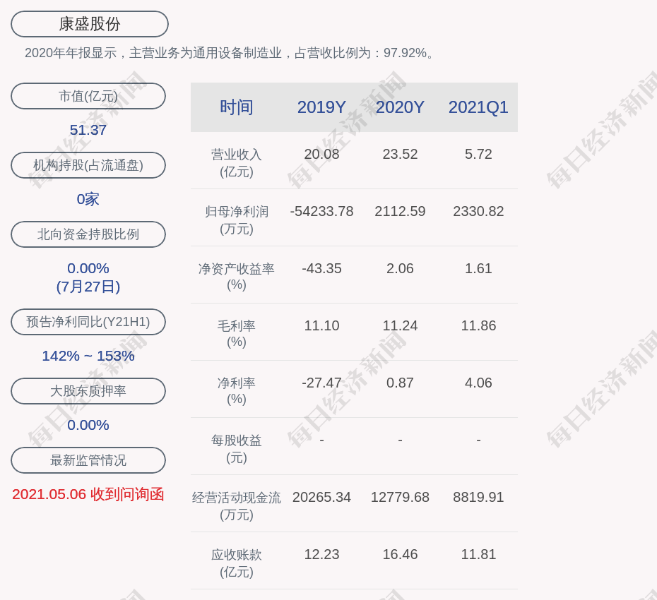 2020年年报显示,康盛股份的主营业务为通用设备制造业,占营收比例为:97.92%。