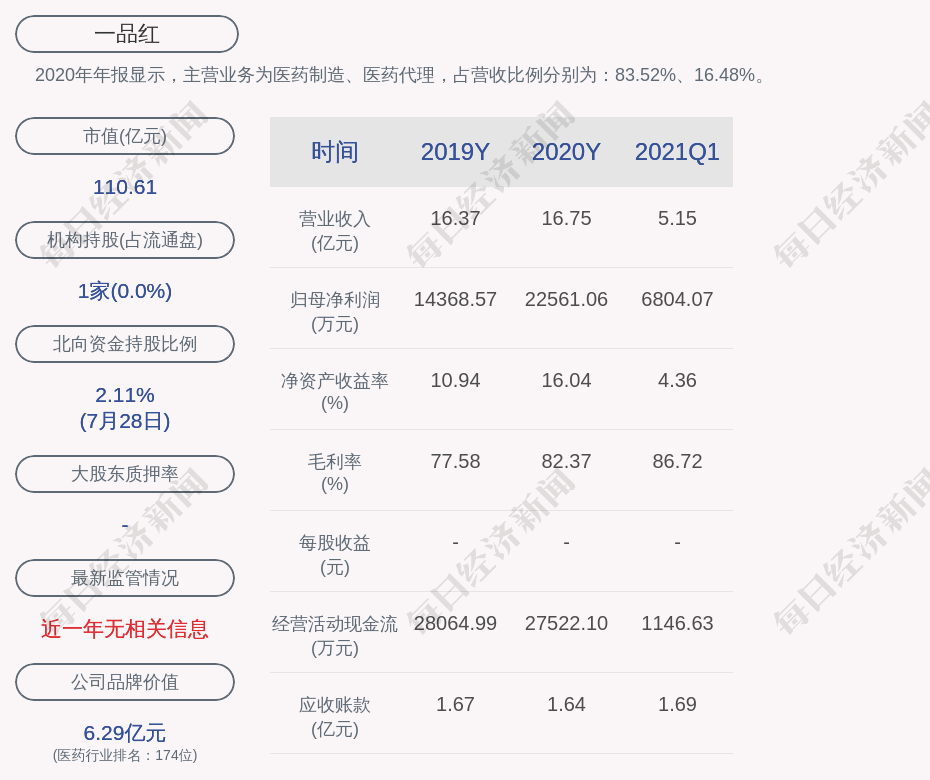 2020年年报显示,一品红的主营业务为医药制造、医药代理,占营收比例分别为:83.52%、16.48%。