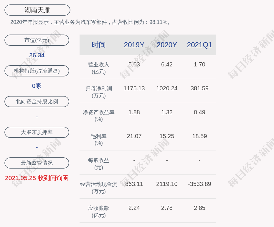 2020年年报显示,湖南天雁的主营业务为汽车零部件,占营收比例为:98.11%。